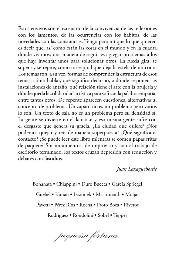 Estos ensayos son el escenario de la convivencia de las reflexiones con los lamentos, de las ocurrencias con los hábitos, de las novedades con las constancias. Tengo para mí que lo que quieren es decir que, así como están las cosas en el mundo y en la cuadra donde vivimos, una manera de seguir es agregar problemas a los que hay, inventar unos para solucionar otros. La rueda gira, se supera y se repite, como un espiral que deja la estela de un cono. Los temas son, a su vez, formas de comprender la estructura de esos temas: cómo hablar, qué significa decir no, a dónde se ponen las instalaciones de antaño, qué relación tiene el arte con la brujería y dónde queda la solidaridad artística para sofocar la palabra empatía, entre tantos otros. De repente aparecen cuestiones, alternativas al concepto de problema. Un zapato no es un problema pero varios lo son. Un texto de sala no es un problema pero su densidad sí. La gente se divierte en el karaoke y esa misma gente sufre con el desgaste que genera su gracia. ¿La ciudad qué quiere? ¿Nos podemos quejar y reír de manera superpuesta? ¿Qué significa el contacto? ¿Se puede leer este libro mientras se comen papas fritas de paquete? Sin miramientos, de improviso y con el trabajo de escritorio terminado, los textos cruzan depresión con seducción y debates con fastidios.